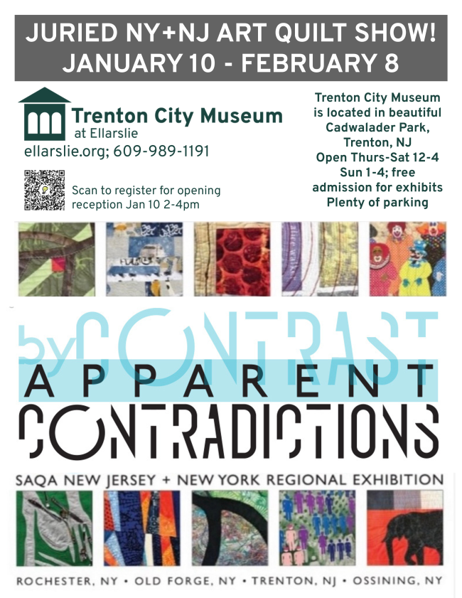 The 2026 art exhibition season is going strong with byCONTRAST: Apparent Contradictions! This regional juried exhibition is presented in coordination with Studio Art Quilt Associates NY+NJ. Read more about this colorful show of 30 art quilts and come see it. Watch for details and save the date for the Gallery Walk-through with quilters on the show's closing day of February 8!